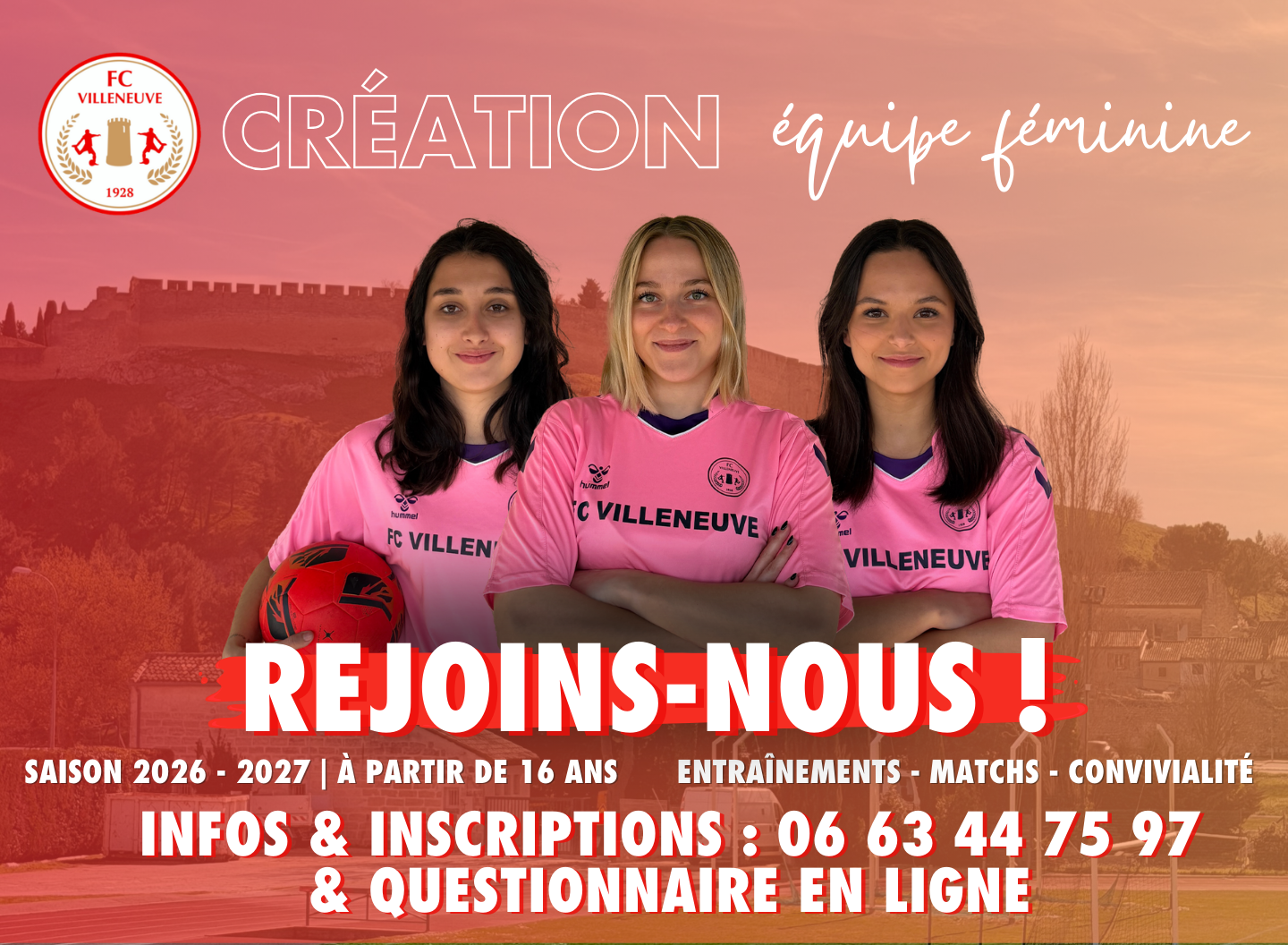 Le club24 février 2026 10 ⚽💗 L’ÉQUIPE FÉMININE DU FC VILLENEUVE, C’EST OFFICIEL ! 💗⚽ On a lancé l’idée il y a une semaine… Et la réponse a dépassé nos attentes. Des joueuses motivées, des licenciés “bouillants” pour supporter, des messages d’encouragement, une vraie énergie autour du projet 🔥 Alors oui, on se lance ! Le FC Villeneuve crée son équipe féminine pour la saison 2026-2027 ✨ Un projet porté par tout un club. 👉 À partir de 16 ans👉 Entraînements & matchs👉 Priorité au plaisir, au collectif et à la convivialité Que tu aies déjà joué ou que tu veuilles te lancer, c’est le moment 💪 📲 Inscriptions ouvertes :🔗 Questionnaire en ligne → lien disponible ici📞 06 63 44 75 97 Merci à toute la famille FCV pour l’engouement 🙏 Continuez à partager et à soutenir ce projet : on a hâte d’écrire cette nouvelle page du club tous ensemble ⚽💗