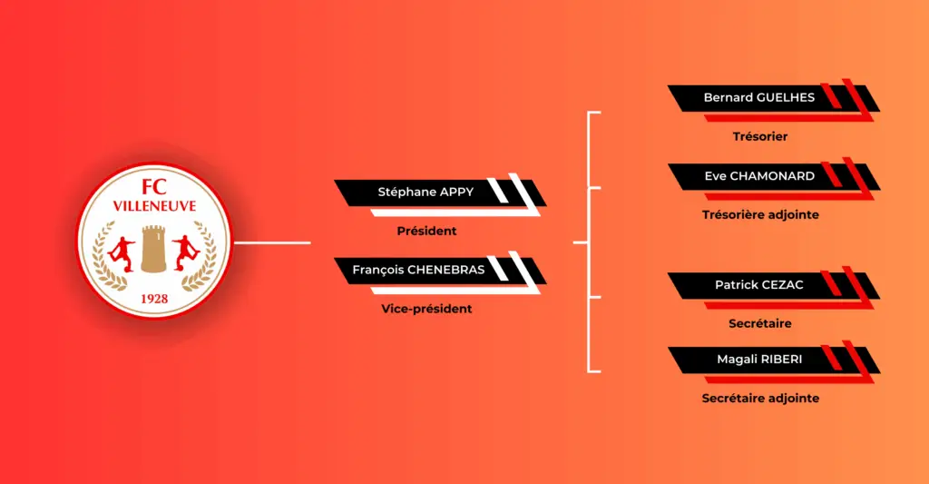 Découvrez ci-dessous les membres du bureau et leurs fonctions, qui contribuent ensemble à faire vivre et grandir le FC Villeneuve, au service des joueurs, éducateurs, bénévoles et supporters.